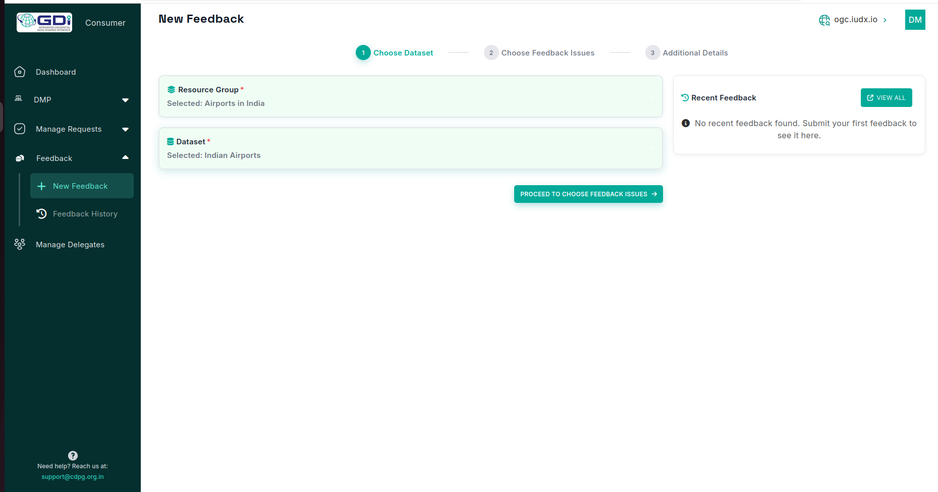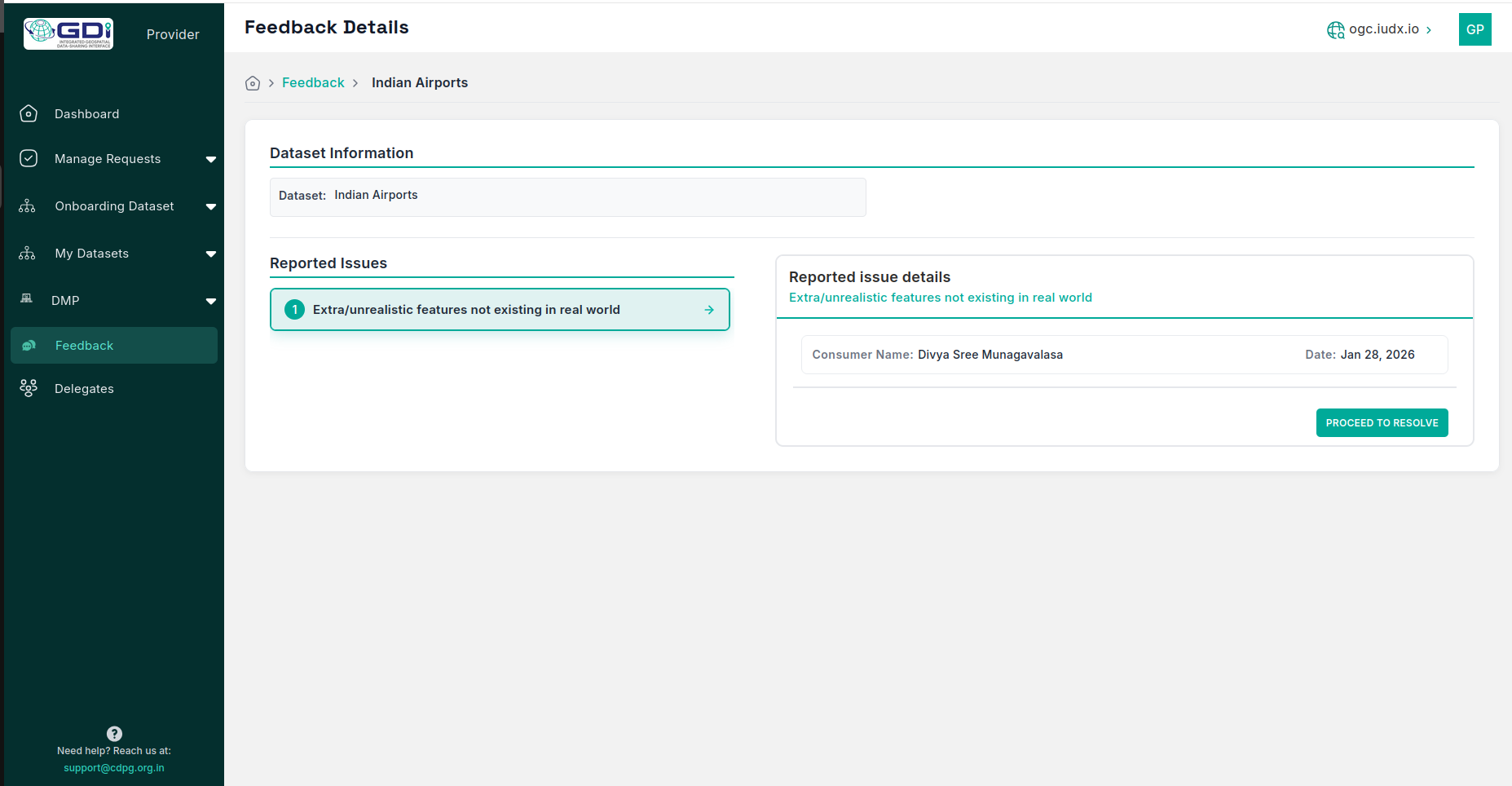 Each resource item in the GDI catalogue can be evaluated by a consumer driven feedback mechanism, through which consumers can submit issues related to that dataset. Once an issue is resolved by the provider, its status is updated to “resolved” and this change is reflected at the consumer’s end. For every resource item in the catalogue, the feedback icon enables a view that shows the total number of issues raised, how many users have raised them, and the detailed list of issues reported, along with a time‑series plot of the number of issues against date that indicates when issues were created, how many were raised on each date, when they were resolved, and how many were closed over time.