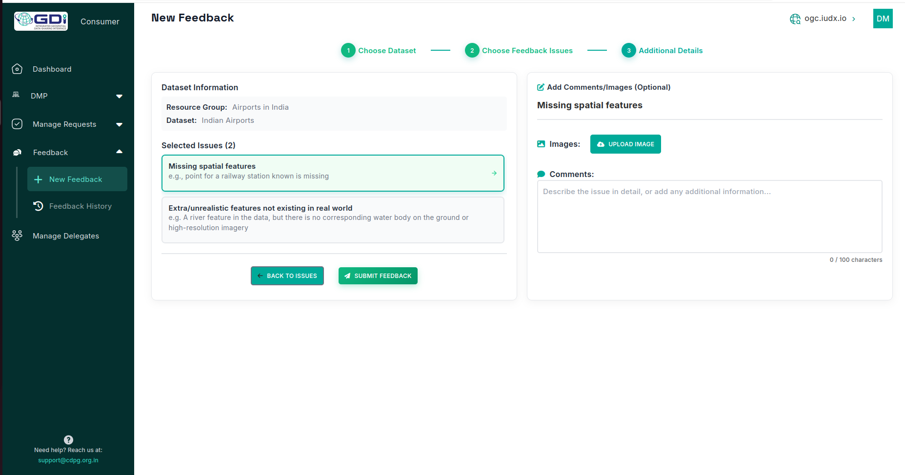 The feedback submission process in the GDI catalogue is initiated by consumers. In the feedback tab of the consumer panel, click on ‘new feedback’ option and the users first select the resource group and specific resource item (dataset), then choose from predefined data quality issues aligned with ISO 19157 standards, including sub-issues. Next, they can provide additional details for the selected issue, such as image attachments and comments, before submitting with their consumer information. The panel also features a feedback history tab that displays all raised issues along with their resolution status.