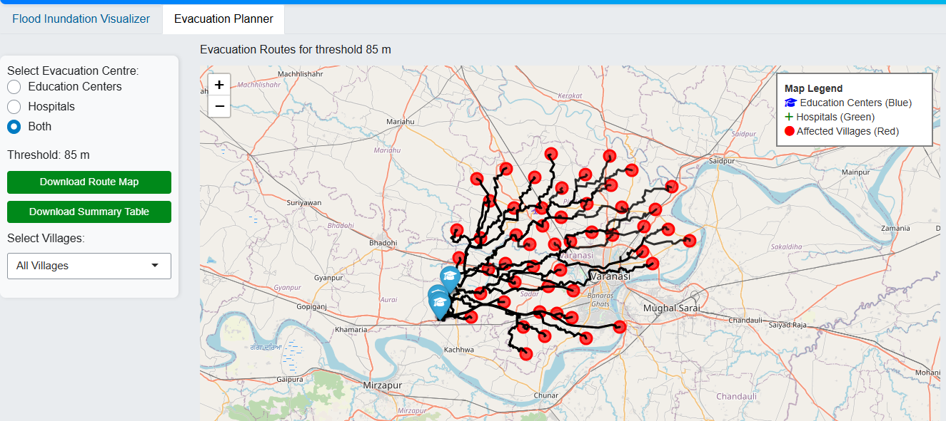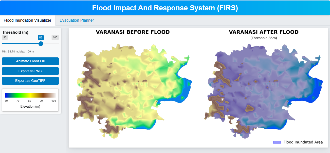 The Flood Impact and Response System (FIRS) Dashboard offers a comprehensive and practical solution for flood preparedness, impact assessment, and evacuation planning in Varanasi’s flood-prone urban environment. By integrating DEM-based flood inundation simulation with elevation-aware evacuation routing, the platform delivers fine-scale, actionable insights that support informed and timely decision-making. Its interactive maps, real-time visualization, and exportable route and impact summaries make it especially useful for emergency responders, planners, and local authorities who must quickly identify at-risk areas, evaluate safe routes, and coordinate evacuations during critical hours. The dashboard’s lightweight computational design ensures rapid scenario generation, allowing users to examine flood impacts for varying water-level thresholds and immediately understand which villages, roads, and facilities are affected.