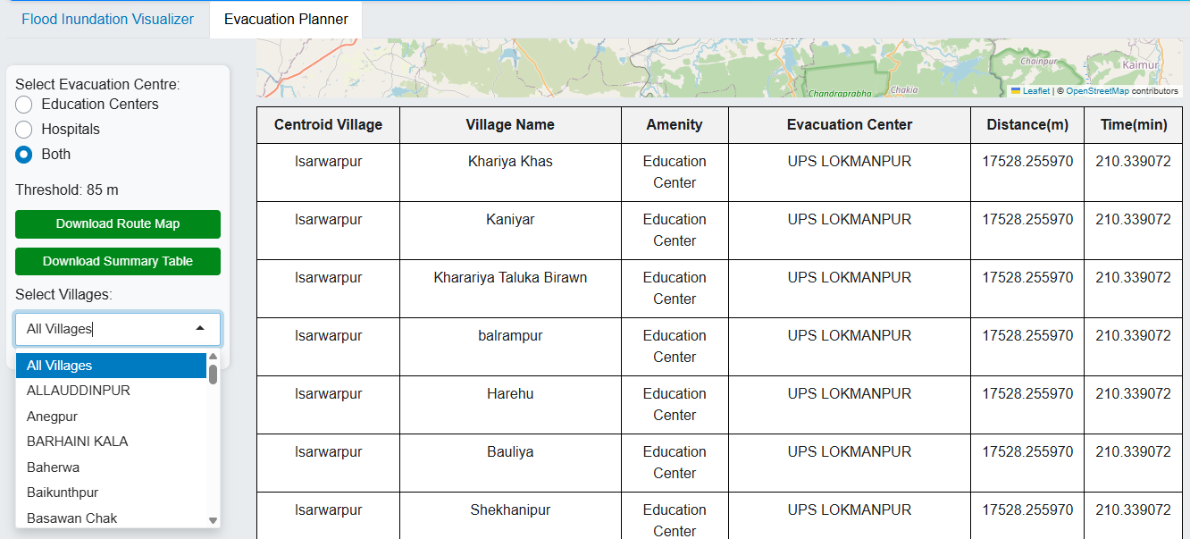 The Evacuation Planner module of the FIRS dashboard delivers a sophisticated, elevation-aware decision-support system designed to guide safe and efficient evacuation during flood events. Leveraging the DEM-based inundation layer, the module first identifies all affected village centroids and applies K-Means clustering to form spatially coherent evacuation zones, reducing routing redundancy and improving computational efficiency. Each cluster is assigned a representative village centroid that functions as the primary origin for evacuation modeling. A topologically clean, elevation-annotated road network is then integrated, where each edge is weighted using a hybrid cost function combining Euclidean distance with elevation-based penalties to avoid vulnerable, low-lying segments. The system employs a modified Dijkstra algorithm with early-exit optimization to rapidly compute elevation constrained routes to the five nearest education or healthcare facilities identified as potential evacuation centers. Results are visualized through an interactive map and a detailed tabular interface that reports optimal routes, recommended centers, distances, estimated travel times, and centroid coordinates for each village.