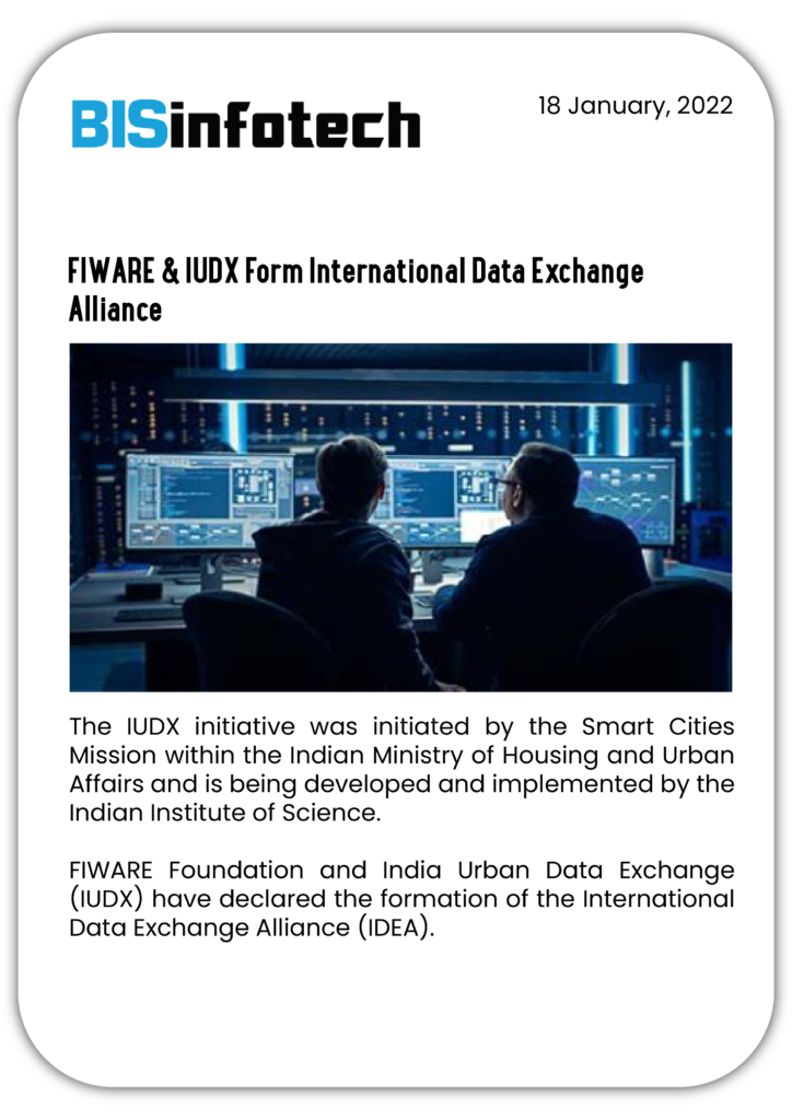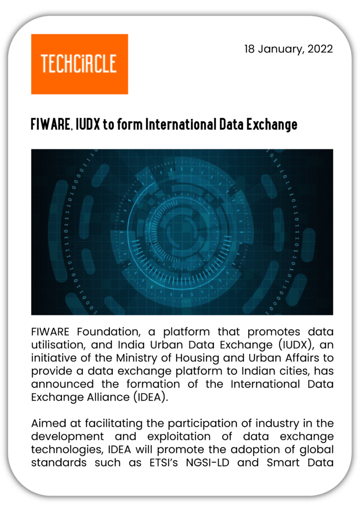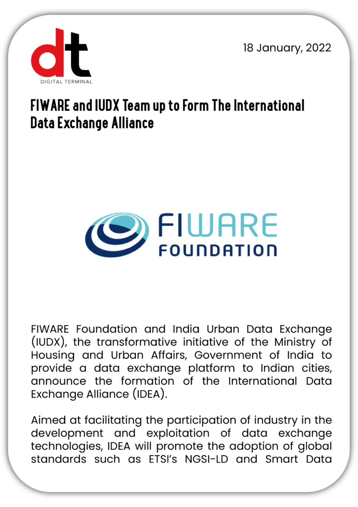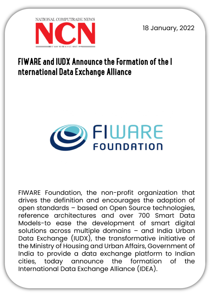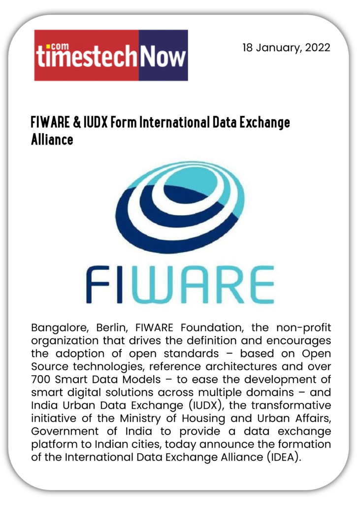 Bangalore, Berlin, January 17, 2022 — FIWARE Foundation, the non-profit organization that drives the definition and encourages the adoption of open standards – based on Open Source technologies, reference architectures and over 700 Smart Data Models – to ease the development of smart digital solutions across multiple domains – and India Urban Data Exchange (IUDX), the transformative initiative of the Ministry of Housing and Urban Affairs, Government of India to provide a data exchange platform to Indian cities, today announce the formation of the International Data Exchange Alliance (IDEA).